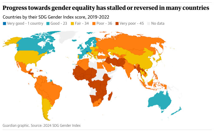Ο δείκτης SDG, ο οποίος μετράει την ισότητα των φύλων σε 139 χώρες, έδωσε σε 45 χώρες – συμπεριλαμβανομένων μεγάλων τμημάτων της δυτικής, κεντρικής και υποσαχάριας Αφρικής, της Μέσης Ανατολής και χωρών της Ασίας – τη χειρότερη βαθμολογία («πολύ φτωχή»).
