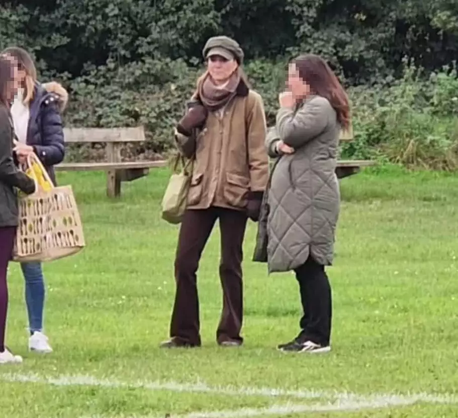 Η πριγκίπισσα Κάθριν, φαίνεται να αλληλεπιδρά με άλλους γονείς στο γήπεδο, ντυμένη σε ουδέτερες αποχρώσεις του φθινοπώρου με καφέ γάντια και παλτό.