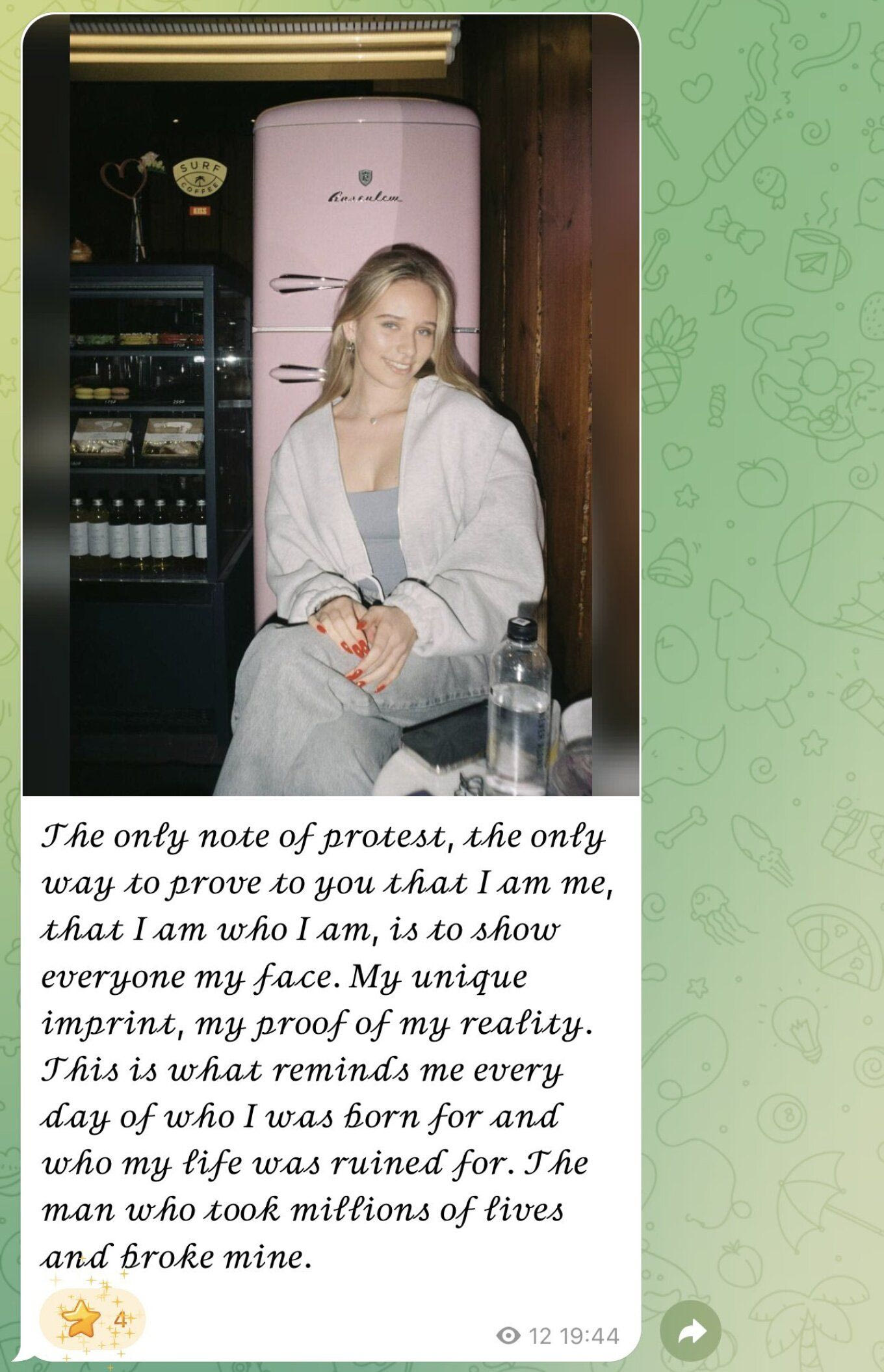 Η Ροζόβα – ψευδώνυμο της Ελισαβέτα Κριβονογκίκ – έγραψε στον προσωπικό της λογαριασμό στο Telegram: «Ο άντρας που πήρε εκατομμύρια ζωές και κατέστρεψε τη δική μου». Παρότι δεν κατονομάζει τον Πούτιν, το μήνυμά της έχει ερμηνευτεί ως προσωπική αιχμή, καθώς εδώ και χρόνια πληθαίνουν οι ενδείξεις ότι είναι καρπός της σχέσης του Ρώσου προέδρου με την πρώην μουσικό Σβετλάνα Κριβονογκίκ.