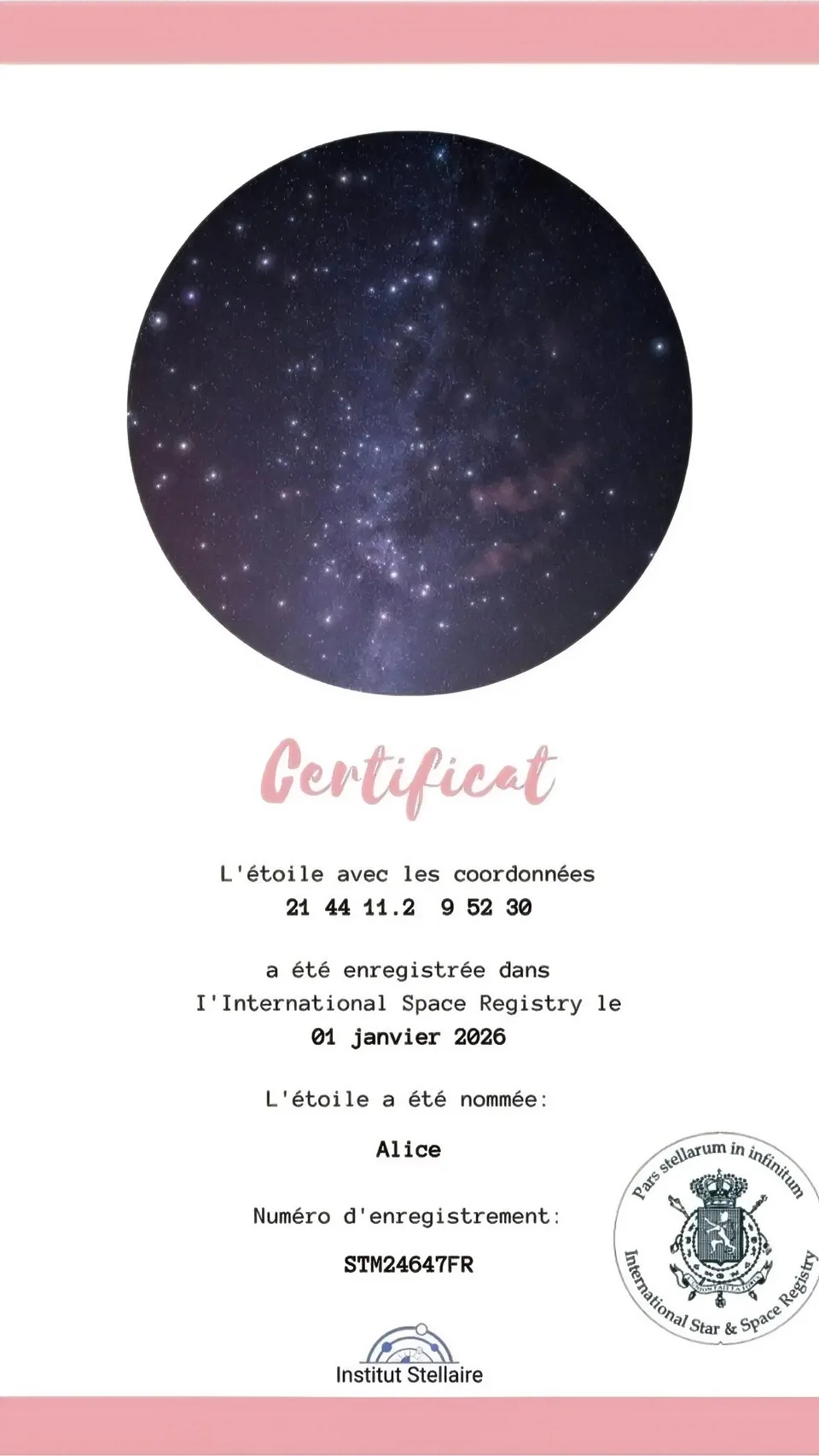 Στον προσωπικό του λογαριασμό στο Instagram δημοσίευσε πιστοποιητικό ονοματοδοσίας αστεριού, το οποίο, σύμφωνα με τα στοιχεία που αναγράφονται, καταχωρήθηκε την 1η Ιανουαρίου 2026 με συγκεκριμένες αστρονομικές συντεταγμένες και φέρει πλέον το όνομα «Αλίκη».