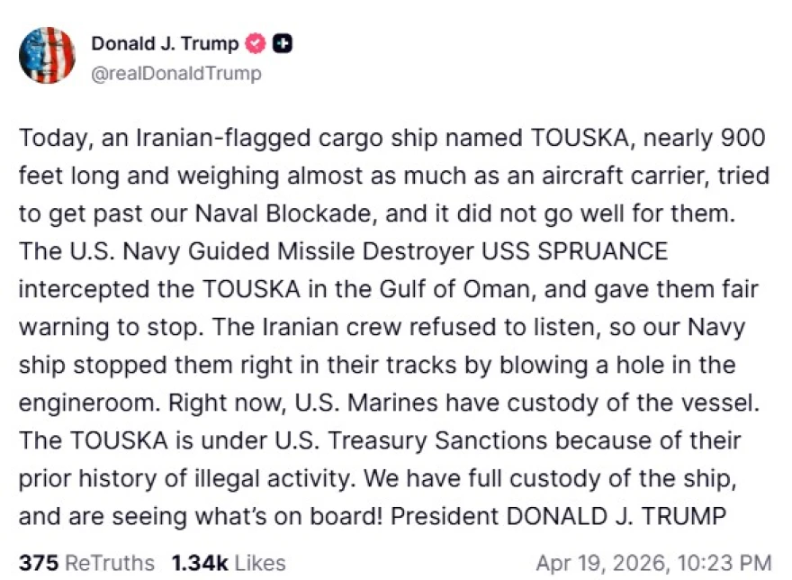 Σε ανάρτησή του, ο Ντόναλντ Τραμπ ανέφερε ότι το φορτηγό πλοίο TOUSKA, μήκους σχεδόν 274 μέτρα και βάρους σχεδόν όσο ένα αεροπλανοφόρο, επιχείρησε να περάσει τον ναυτικό αποκλεισμό που έχει επιβληθεί από τις ΗΠΑ.