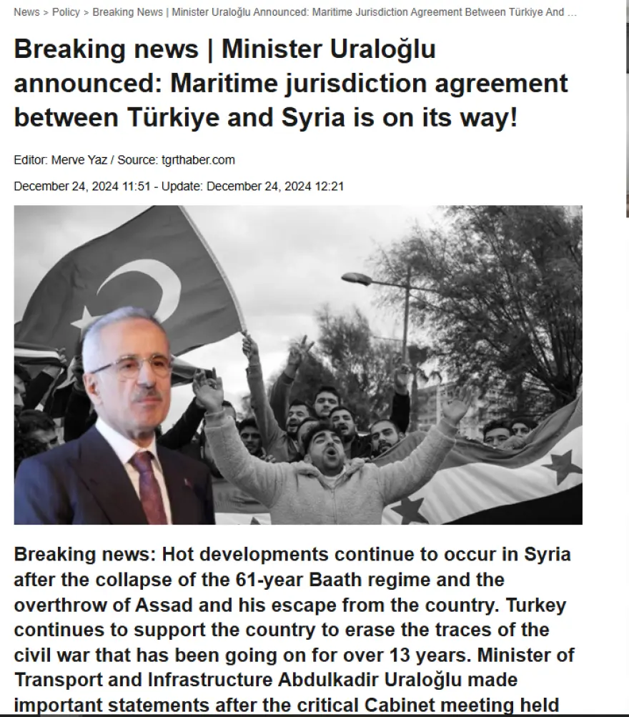 Σύμφωνα με την αγγλόφωνη έκδοση της Χουριέτ, η συμφωνία εντάσσεται σε ένα ευρύτερο σχέδιο δράσης που περιλαμβάνει τη θαλάσσια οριοθέτηση και την ανασυγκρότηση της Συρίας μετά την ανατροπή του καθεστώτος Άσαντ. Ο Τούρκος υπουργός Μεταφορών, Αμπτουλκαντίρ Ουράλογλου, δήλωσε πως η συμφωνία θα αφορά την οριοθέτηση θαλασσίων ζωνών δικαιοδοσίας και την αποκατάσταση βασικών υποδομών στη Συρία, όπως αεροδρόμια, σιδηροδρόμους οδικές συνδέσεις και τηλεπικοινωνίες.