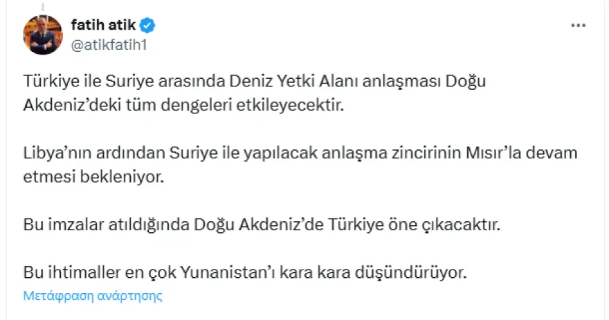 Σε ανάρτησή του στο Twitter ο δημοσιογράφος του TGRT Haber, Φατίχ Ατίκ, προκαλεί, αφού αναφέρεται στην Ελλάδα, λέγοντας πως οι κινήσεις της Τουρκίας προκαλούν ανησυχία στην Αθήνα, ενώ προαναγγέλλει και υποτιθέμενη επερχόμενη συμφωνία της Τουρκίας με την Αίγυπτο για ΑΟΖ. «Η συμφωνία για την περιοχή θαλάσσιας δικαιοδοσίας μεταξύ της Τουρκίας και της Συρίας θα επηρεάσει όλες τις ισορροπίες στην Ανατολική Μεσόγειο. Μετά τη Λιβύη, η αλυσίδα των συμφωνιών με τη Συρία αναμένεται να συνεχιστεί και με την Αίγυπτο. Όταν γίνουν αυτές οι υπογραφές, η Τουρκία θα έρθει στο προσκήνιο στην Ανατολική Μεσόγειο. Αυτές οι δυνατότητες κάνουν την Ελλάδα να σκέφτεται λυπηρά περισσότερο», αναφέρει χαρακτηριστικά.
