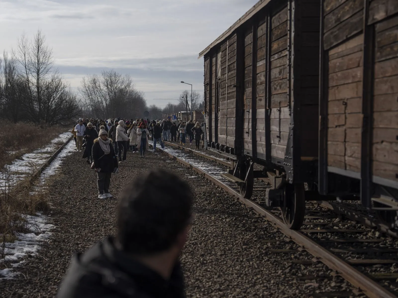 Τουρίστες επισκέπτονται σιδηροδρομικές γραμμές και ένα βαγόνι που χρησιμοποιήθηκε για τη μεταφορά κρατουμένων κατά τον Β’ Παγκόσμιο Πόλεμο, ακριβώς έξω από το πρώην ναζιστικό στρατόπεδο συγκέντρωσης και εξόντωσης Άουσβιτς-Μπίρκεναου