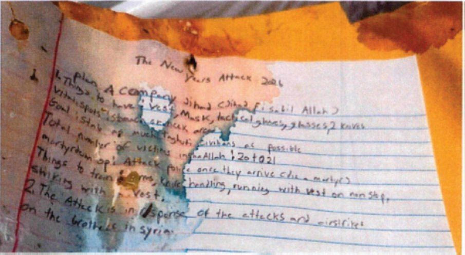 Πράκτορες του Ομοσπονδιακού Γραφείου Ερευνών (FBI), που πραγματοποίησαν έρευνες στην οικία του 18χρονου, βρήκαν ένα χειρόγραφο σημείωμα με τίτλο «Επίθεση της Πρωτοχρονιάς του 2026», όπου φέρεται να συζητούσε σχέδια που προέβλεπαν να μαχαιρώσει έως 20 θύματα και να επιτεθεί σε αστυνομικούς που θα έσπευδαν στο σημείο, σύμφωνα με την ανακοίνωση των αρχών.