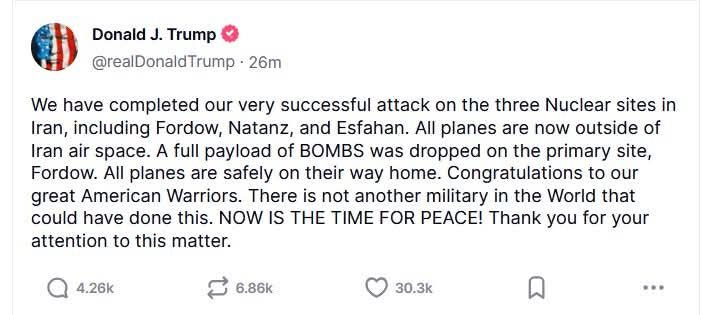 «Ολοκληρώσαμε την πολύ επιτυχημένη επίθεση σε τρεις πυρηνικές εγκαταστάσεις στο Ιράν, συμπεριλαμβανομένων του Φορντό, της Νατάνζ και του Ισφαχάν», αναφέρει η ανάρτηση του αμερικανού προέδρου.