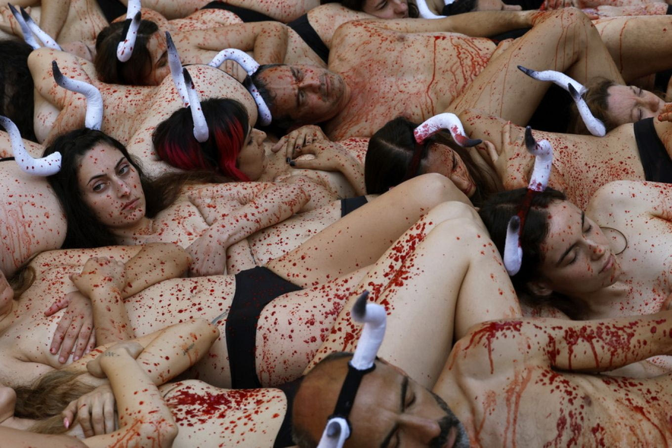 Οι ακτιβιστές υπέρ των δικαιωμάτων των ζώων διαμαρτυρήθηκαν σήμερα στην Παμπλόνα, ξαπλώνοντας στο έδαφος ημίγυμνοι και καλυμμένοι με αίμα, ενώ στα κεφάλια τους υπήρχαν κέρατα ταύρου.