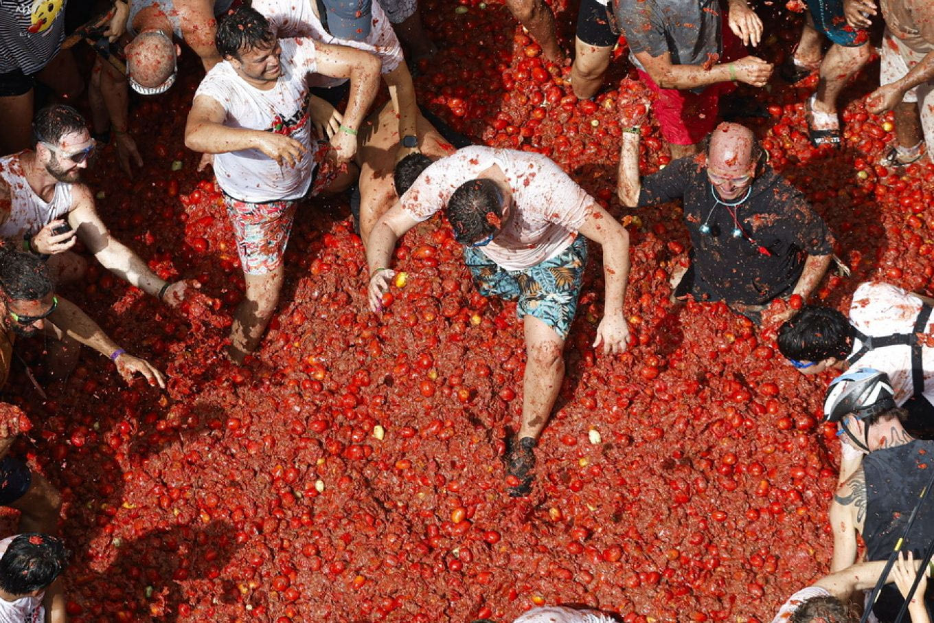 Το διάσημο φεστιβάλ «la Tomatina» ήταν και φέτος μια μοναδική εμπειρία για χιλιάδες συμμετέχοντες που έριξαν ώριμες ντομάτες στους δρόμους της πόλης Μπουνιόλ, στην ανατολική Ισπανία. Το σκηνικό ήταν εντυπωσιακό καθώς οι 20.000 περίπου συμμετέχοντες δημιούργησαν ένα τεράστιο «κόκκινο ποτάμι», πετώντας 120 τόνους ντομάτες.