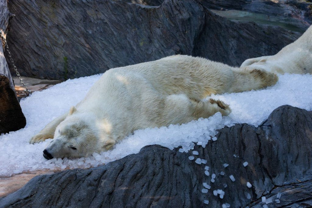 Στην Τσεχία, μια πολική αρκούδα αναζητεί λίγη δροσιά σε έναν λόφο από παγάκια που της έστρωσαν στον Ζωολογικό Κήπο της Πράγας.
