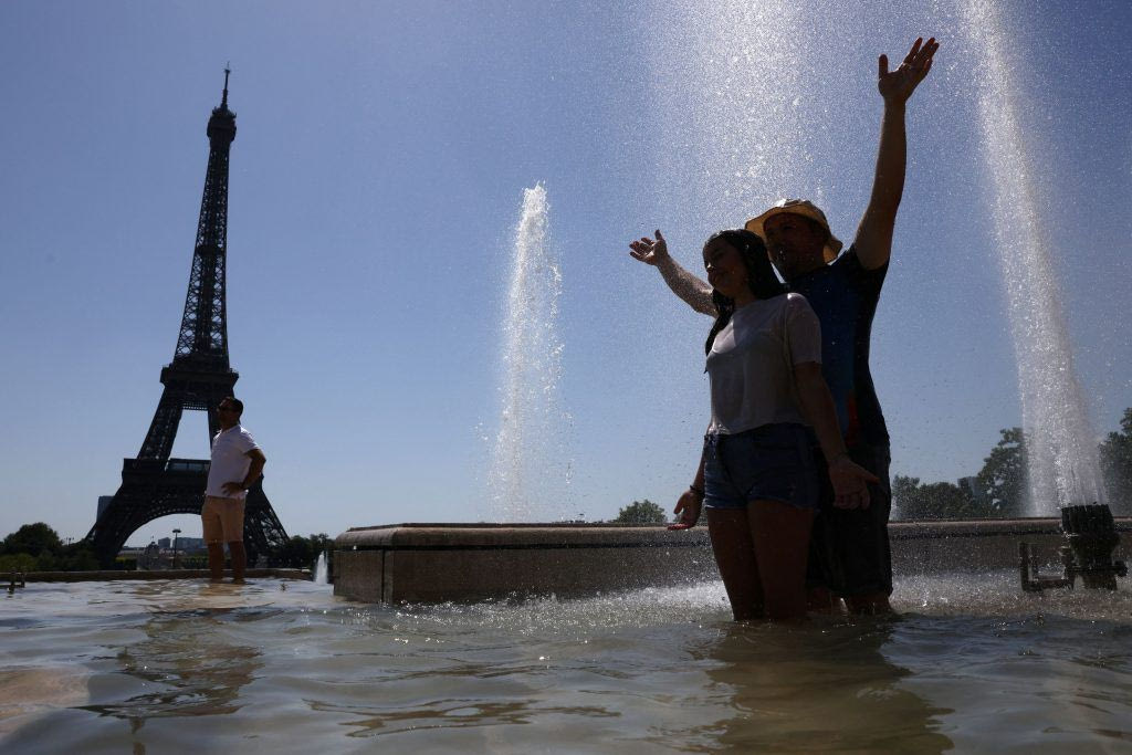 Στη Γαλλία, τουρίστες δροσίζονται στο σιντριβάνι του Τροκαντερό, δίπλα από τον Πύργο του Άιφελ.