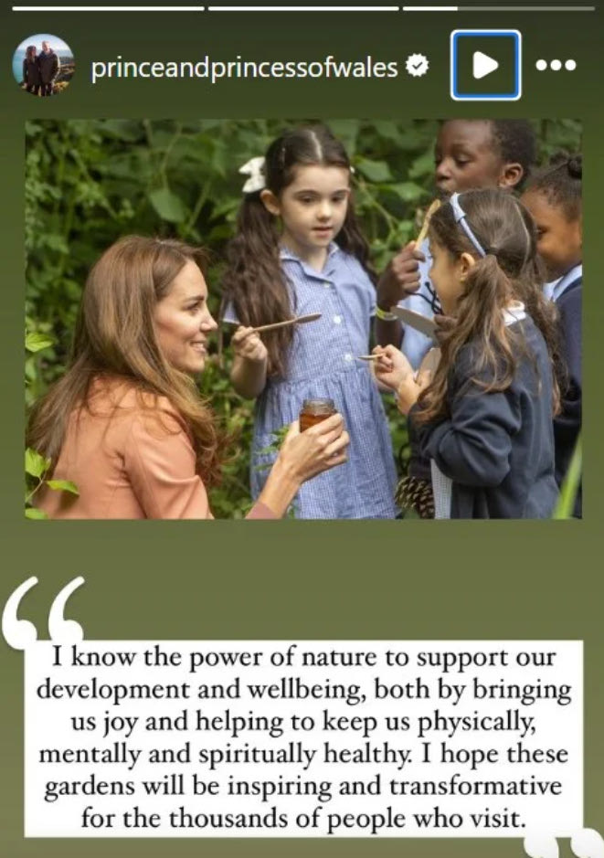 Η πριγκίπισσα της Ουαλίας σε μια σειρά από stories που ανέβασε στην επίσημη σελίδα της στο Instagram χαιρετίζει τη «δύναμη της φύσης» που όπως λέει υποστηρίζει «την ανάπτυξη και την ευεξία μας».
