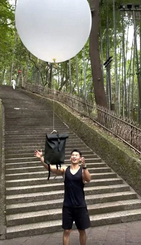 Στο βίντεο που δημοσίευσε στην κινεζική πλατφόρμα κοινωνικής δικτύωσης Douyin, φαίνεται ένα πολύ μεγάλο λευκό μπαλόνι ηλίου δεμένο στην τσάντα του που διευκολύνει την ανάβασή του, καθώς το μπαλόνι σηκώνει στον αέρα την τσάντα, μειώνοντας το βάρος του.
