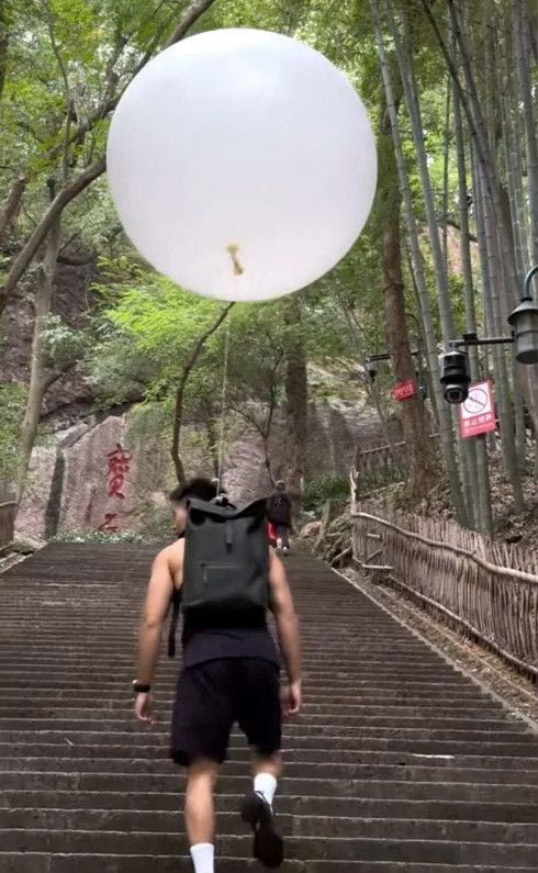 Πιο συγκεκριμένα, ο fitness influencer ονόματι Pu χρησιμοποίησε ένα μπαλόνι φουσκωμένο με ήλιο για να ελαφρύνει το βάρος του σακιδίου του κατά τη διάρκεια της πεζοπορίας.