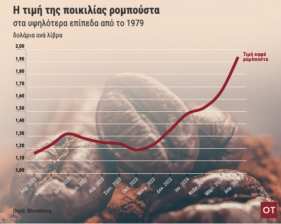 Η τιμή της ποικιλίας Robusta έχει αγγίξει πλέον τα 2 δολάρια ανά λίβρα σύμφωνα με στοιχεία από τη Διεθνή Οργάνωση Καφέ (International Coffee Organization -ICO) τα οποία παρουσίασε το Bloomberg. Τα στοιχεία αυτά δείχνουν ότι οι τιμές χονδρικής αυξήθηκαν κατά 17% μέσα στον Απρίλιο, φτάνοντας στα υψηλότερα επίπεδα από το 1979. Τα συμβόλαια μελλοντικής εκπλήρωσης στο Λονδίνο για τη συγκεκριμένη ποικιλία καφέ έχουν παρουσιάσει αύξηση τιμών τους πέντε από τους τελευταίους έξι μήνες και τελικά οι αυξήσεις κινδυνεύουν να περάσουν άμεσα στους καταναλωτές αφού οι τιμές χονδρικής ανεβαίνουν διαρκώς.