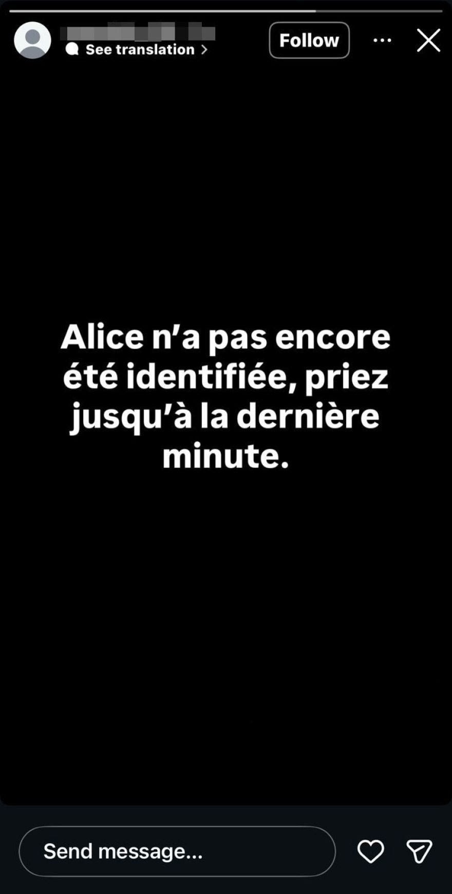 Στην ανάρτησή του ο Ρομέν Καλλέργης αναφέρει: «Η Αλίκη δεν έχει ακόμη ταυτοποιηθεί, προσευχηθείτε μέχρι την τελευταία στιγμή».