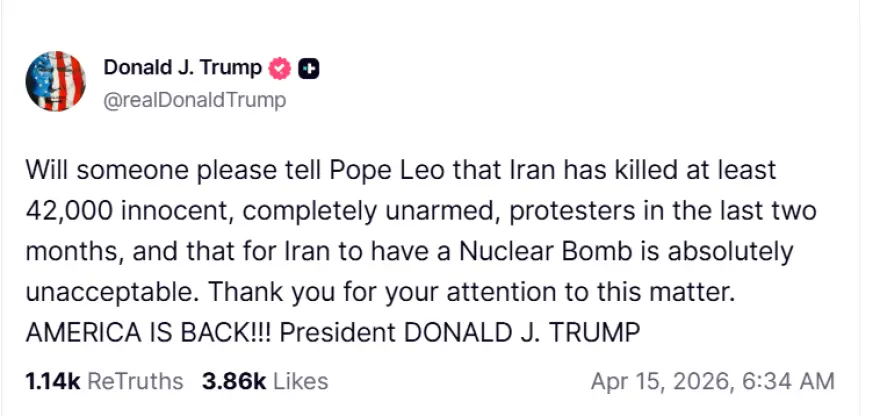 Παρά τις αντιδράσεις που έχει προκαλέσει η πολεμική κατά του προκαθήμενου της Ρωμαιοκαθολικής Εκκλησίας, ο Τραμπ έγραψε στο Truth Social για τον Πάπα Λέοντα: