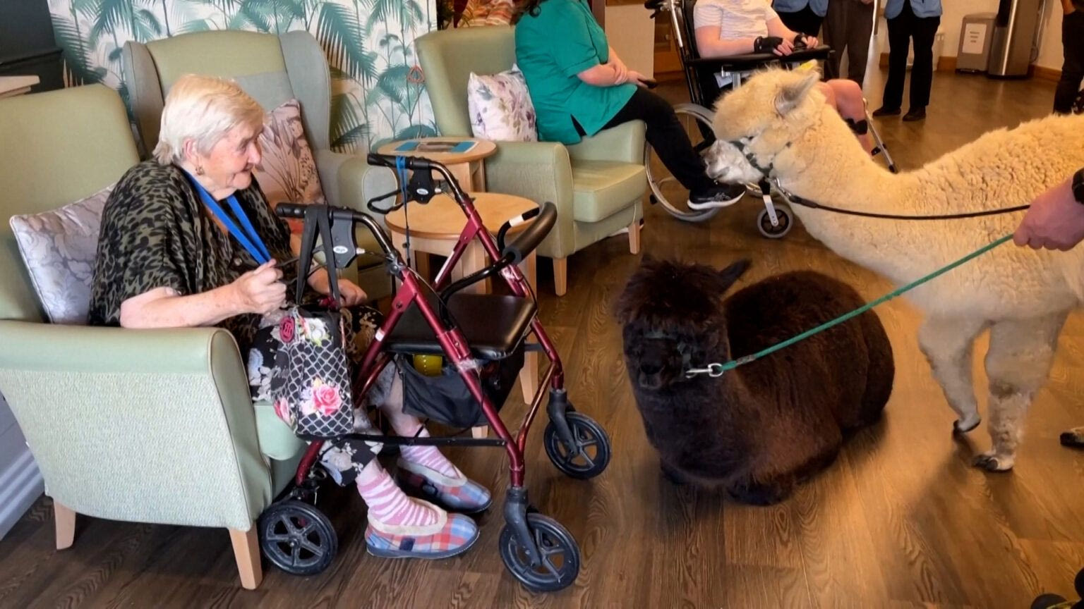 Πλαισιωμένος από ένα τσούρμο θεατών που τραβούσαν φωτογραφίες και βίντεο, ο Ιρλανδός αγρότης Joe Phelan οδήγησε δύο αλπάκα στο διάδρομο ενός τοπικού γηροκομείου.