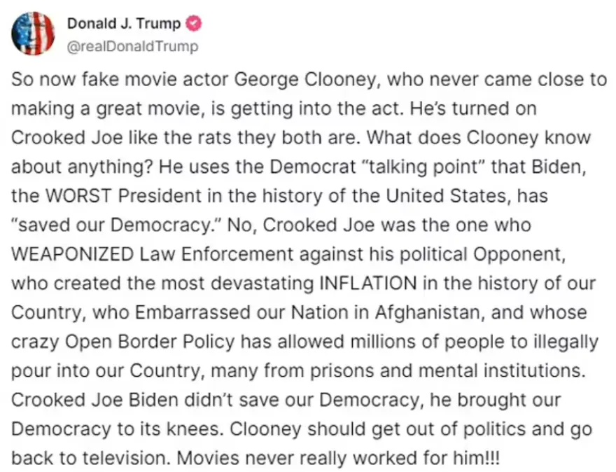 Στη συνέχεια, πρόσθεσε: «Έχει στραφεί εναντίον του Τζο σαν τα ποντίκια που είναι και οι δύο. Τι ξέρει ο Κλούνεϊ για οτιδήποτε; Χρησιμοποιεί το επιχείρημα των Δημοκρατικών ότι ο Μπάιντεν, ο χειρότερος πρόεδρος στην ιστορία των Ηνωμένων Πολιτειών “έσωσε τη Δημοκρατία μας”. Όχι, ο απατεώνας Τζο ήταν αυτός που οπλοποίησε την επιβολή του νόμου εναντίον του πολιτικού του αντιπάλου, που δημιούργησε τον πιο καταστροφική πληθωρισμό στην ιστορία της χώρας μας, που ντρόπιασε το έθνος μας στο Αφγανιστάν και του οποίου η τρελή πολιτική των ανοικτών συνόρων επέτρεψε σε εκατομμύρια ανθρώπους να εισέλθουν παράνομα στη χώρα μας, πολλοί από αυτούς από φυλακές και ψυχιατρεία. Ο απατεώνας Τζο Μπάιντεν δεν έσωσε τη Δημοκρατία μας, γονάτισε τη Δημοκρατία μας. Ο Κλούνεϊ πρέπει να φύγει από την πολιτική και να επιστρέψει στην τηλεόραση. Οι ταινίες δεν του βγήκαν ποτέ σε καλό!!!».