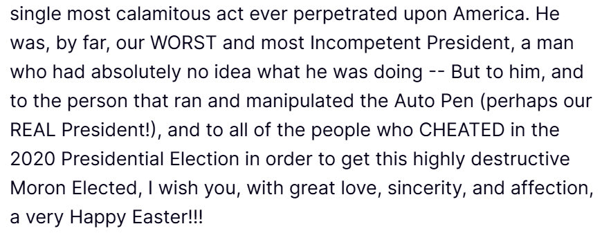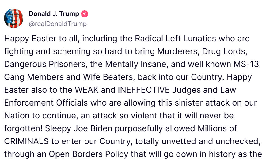 «Καλό Πάσχα σε όλους, συμπεριλαμβανομένων των Ριζοσπαστών Αριστερών Τρελών που αγωνίζονται και συνωμοτούν σκληρά για να φέρουν πίσω Δολοφόνους, Ναρκέμπορους, Επικίνδυνους Κατάδικους, Ψυχικά Ασθενείς, και γνωστά Μέλη της MS-13 και Κακοποιητές Γυναικών στη Χώρα μας», έγραψε ο Αμερικανός πρόεδρος.