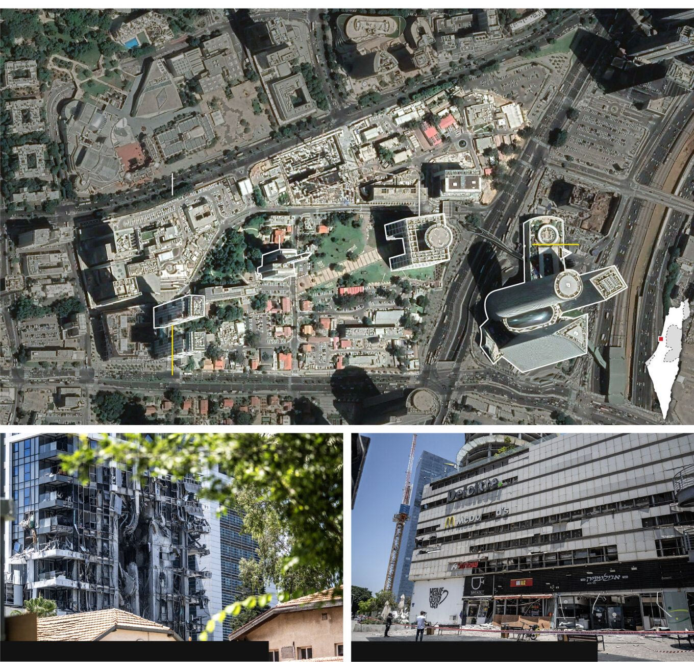 Στο Τελ Αβίβ, δορυφορικές εικόνες δείχνουν ζημιές σε κτίρια κοντά στο αρχηγείο του υπουργείου Άμυνας. Στο παραθαλάσσιο Μπατ Γιαμ, drone κατέγραψε τις εκτεταμένες καταστροφές από πυραυλικό πλήγμα τα ξημερώματα της Κυριακής. Στην Πετάχ Τίκβα, στα ανατολικά του Τελ Αβίβ, κάμερες ασφαλείας και drones αποτύπωσαν τη στιγμή της πρόσκρουσης πυραύλου σε συγκρότημα κατοικιών τη Δευτέρα, καταγράφοντας την ένταση της έκρηξης και τις ζημιές που ακολούθησαν.