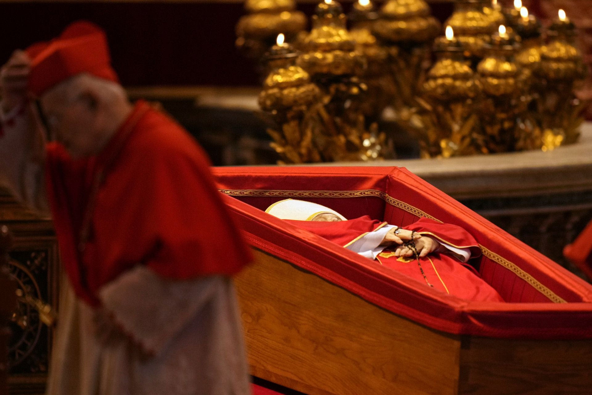 Η τελετή στη Βασιλική του Αγίου Πέτρου ολοκληρώθηκε, με τους καρδινάλιους να παρατάσσονται για να αποτίσουν πρώτοι φόρο τιμής στον εκλιπόντα.