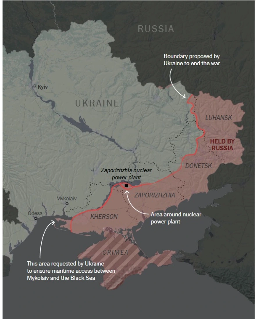 Λίγο αργότερα, καθώς οι συμμετέχοντες έσκυβαν πάνω από τον χάρτη, ο Μάικ Γουόλτς έδωσε στον Ουκρανό υπουργό Άμυνας Ρουστέμ Ουμέροφ έναν σκούρο μπλε μαρκαδόρο. «Ξεκίνα να σχεδιάζεις», του είπε. Ο Ουμέροφ χάραξε πρώτα τα βόρεια σύνορα της Ουκρανίας με τη Ρωσία και τη Λευκορωσία και στη συνέχεια ακολούθησε τη γραμμή επαφής διασχίζοντας τις περιφέρειες Χάρκοβο, Λουγκάνσκ, Ντονέτσκ, Ζαπορίζια και Χερσώνα.