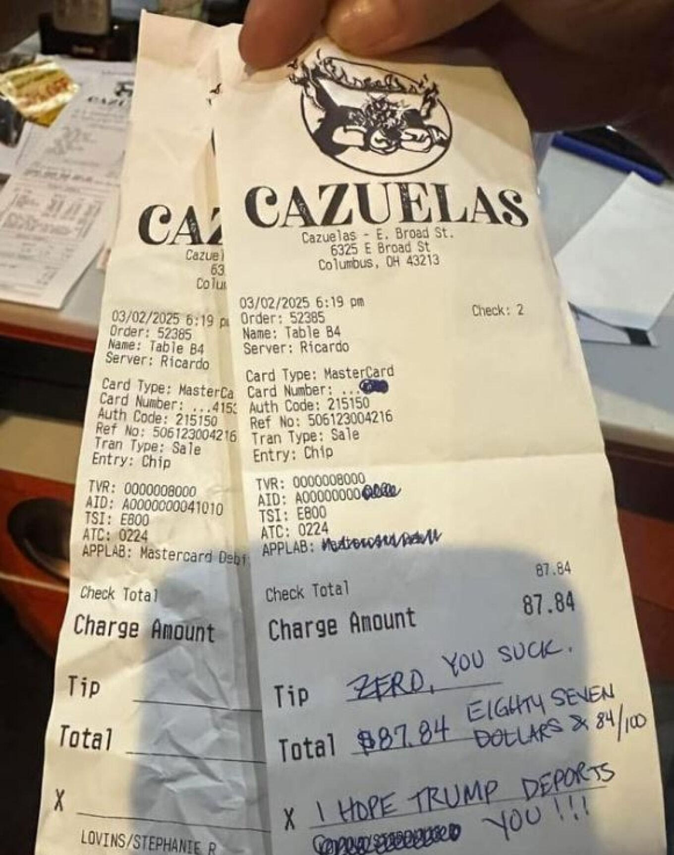 Το περιστατικό συνέβη στο εστιατόριο Cazuelas Mexican Restaurant & Cantina με την Στέφανι Λόβινς, όπως είναι το όνομα της γυναίκας που απολύθηκε, αντί για φιλοδώρημα, να γράφει στην απόδειξη του λογαριασμού των 87,84 δολαρίων, «ελπίζω ο Τραμπ να σε απελάσει» προσθέτοντας «είσαι μηδενικό, είσαι άθλιος».