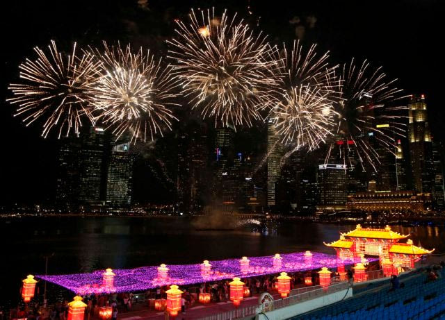 Πυροτεχνήματα ξεπηδούν στον ορίζοντα της πόλης κατά τη διάρκεια των εορτασμών για την κινεζική πρωτοχρονιά στο Marina Bay στη Σιγκαπούρη 29 Ιανουαρίου 201.