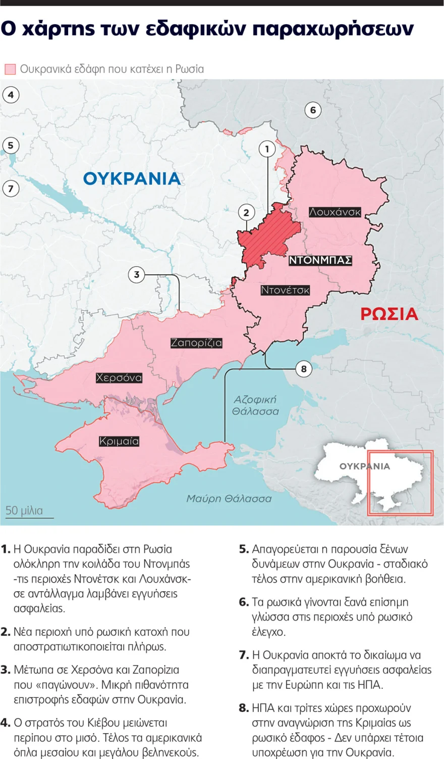 Η λογική του πλαισίου: Η Ουκρανία παραχωρεί ολόκληρο το Ντονμπάς στη Ρωσία και αναγνωρίζει επισήμως την προσάρτηση Κριμαίας, Λουχάνσκ και Ντονέτσκ. Οι γραμμές σε Χερσώνα και Ζαπορίζια παγώνουν πάνω στο σημερινό μέτωπο – αυτό που σήμερα κατέχει η Ρωσία το κρατά και ο Δνείπερος γίνεται και επίσημα φυσικό όριο και σύνορο ανάμεσα σε Μόσχα και Κίεβο. Η Ουκρανία δεσμεύεται να μην ενταχθεί ποτέ στο ΝΑΤΟ, να περιορίσει τον στρατό της σε περίπου 600.000 άνδρες και να δεχθεί περιορισμούς σε επιθετικά όπλα και πυραυλικά συστήματα.