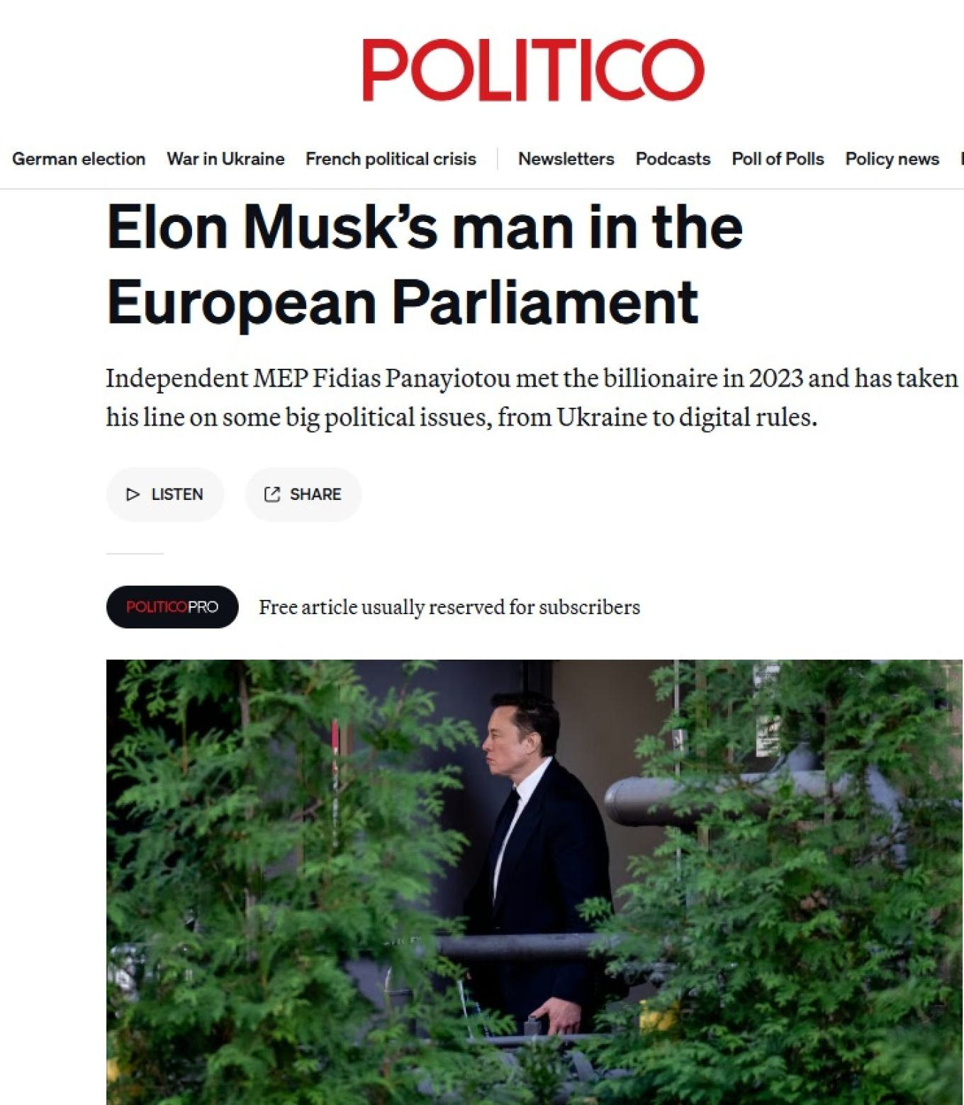 Το Politico αναφέρει πως τον περασμένο μήνα ο Έλον Μασκ δημοσίευσε ένα βίντεο στο Χ «ενός 24χρονου Κύπριου ευρωβουλευτή υποστηρίζοντας ότι η Δύση ήταν καιρός να σταματήσει να βοηθά την Ουκρανία στην αντίστασή της ενάντια στην ευρείας κλίμακας εισβολή του Ρώσου Προέδρου Βλαντιμίρ Πούτιν».