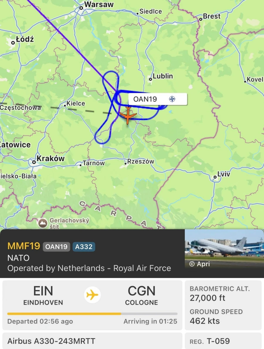 Επίσης ένα αεροσκάφος Airbus A330 Multi-Role Tanker Transport (MRTT) του ΝΑΤΟ, της Βασιλικής Αεροπορίας της Ολλανδίας, βρίσκεται επί του παρόντος πάνω από την Ανατολική Πολωνία, πιθανώς για τον ανεφοδιασμό μαχητικών αεροσκαφών στο πλαίσιο της επιχείρησης Eastern Sentry του ΝΑΤΟ.