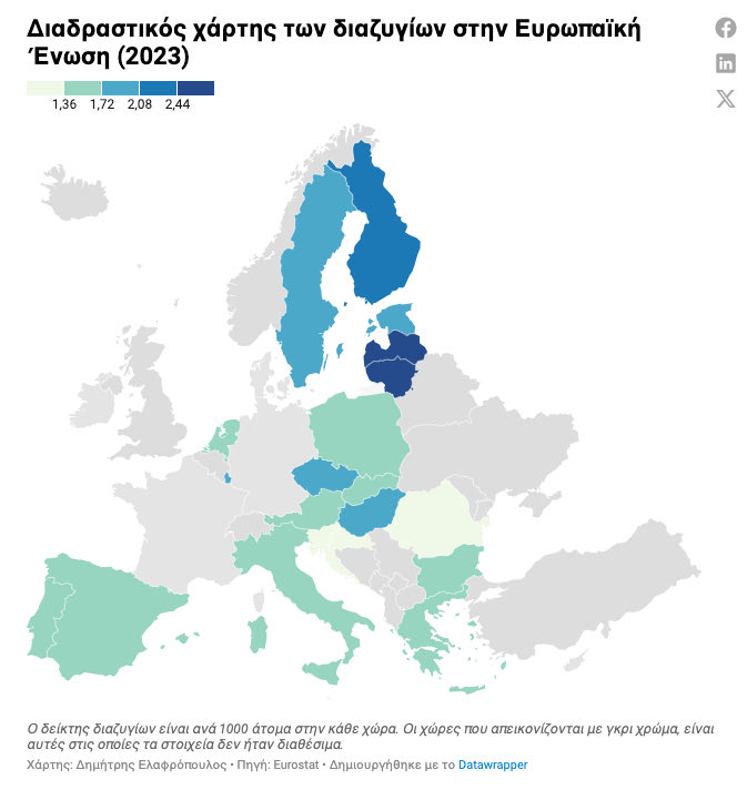 Στα διαζύγια, το χαμηλότερο ποσοστό σημειώθηκε στη Σλοβενία (1,0), την Κροατία (1,1) και τη Ρουμανία (1,2), ενώ τα υψηλότερα ποσοστά καταγράφηκαν στη Λετονία (2,8), τη Λιθουανία (2,5) και τη Φινλανδία (2,1).
