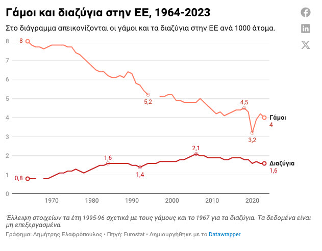 Όσον αφορά τα διαζύγια, η Eurostat εκτιμά ότι το 2023 καταγράφηκαν 1,6 διαζύγια ανά 1.000 άτομα. Ο δείκτης αυτός έχει διπλασιαστεί από το 1964, όταν ήταν 0,8. Το υψηλότερο ποσοστό σημειώθηκε το 2006 (2,1 διαζύγια ανά 1.000 άτομα), ενώ τα τελευταία χρόνια η κατάσταση παρουσιάζεται σχετικά σταθερή.