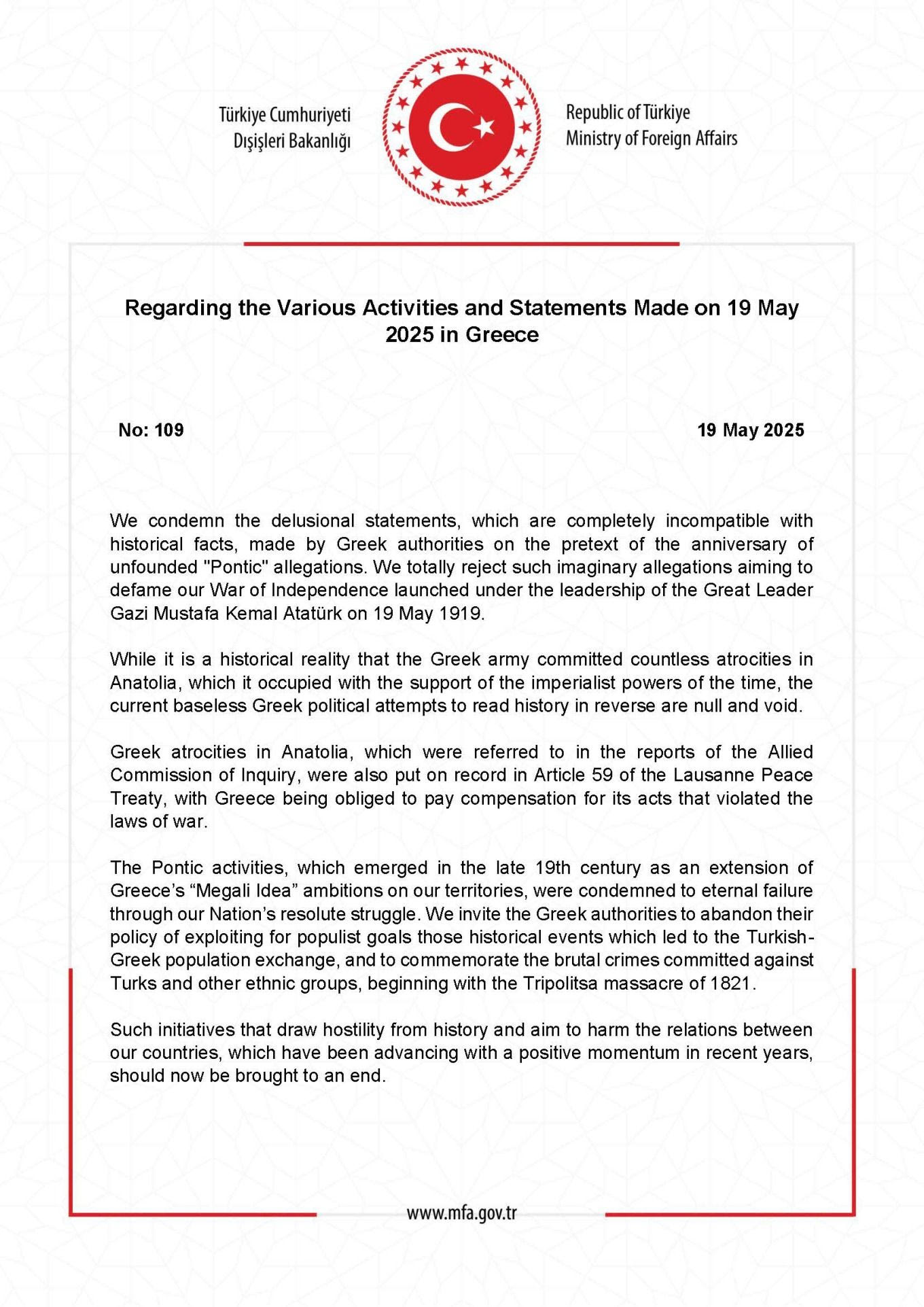 «Καταδικάζουμε τις παραληρηματικές δηλώσεις, οι οποίες είναι απολύτως ασύμβατες με τα ιστορικά γεγονότα, που έγιναν από τις ελληνικές αρχές με αφορμή την επέτειο των αβάσιμων «ποντιακών» ισχυρισμών. Απορρίπτουμε πλήρως αυτούς τους φανταστικούς ισχυρισμούς, που στοχεύουν στη δυσφήμιση του Αγώνα της Ανεξαρτησίας μας, ο οποίος ξεκίνησε υπό την ηγεσία του Μεγάλου Ηγέτη Γαζί Μουσταφά Κεμάλ Ατατούρκ στις 19 Μαΐου 1919.