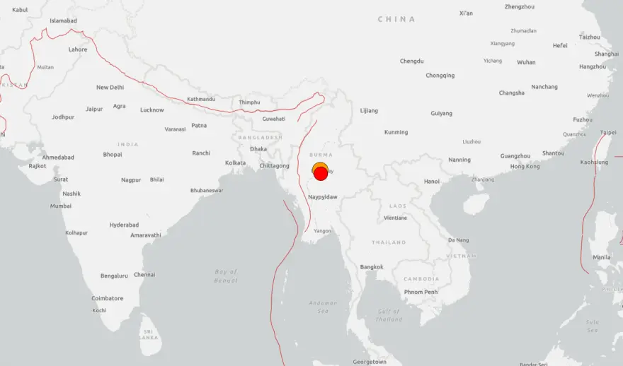 Σεισμός μεγέθους 7,7 βαθμών έπληξε τη Μιανμάρ, ανακοίνωσε σήμερα το Γερμανικό Κέντρο Ερευνών για τις Γεωεπιστήμες (GFZ).