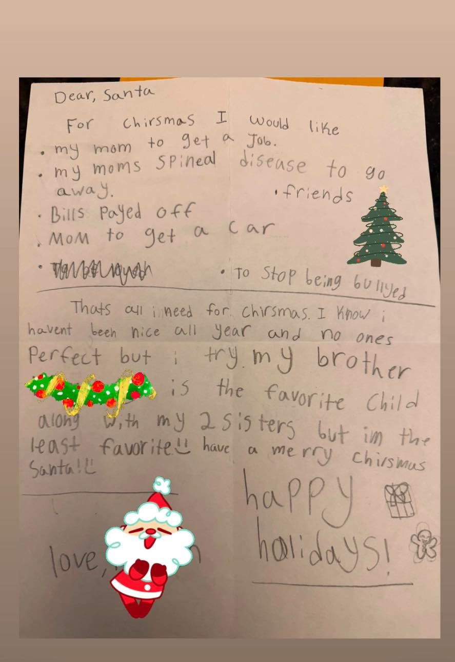 Την Πέμπτη 19 Δεκεμβρίου ο Άγιος Βασίλης παρέλαβε το γράμμα από το 11χρονο κορίτσι, το οποίο δεν ζητούσε τίποτα για τον εαυτό του. Στο γράμμα έγραφε: «Αγαπημένε Άγιε Βασίλη, για τα Χριστούγεννα θα ήθελα η μαμά μου να βρει δουλειά, η ασθένεια της σπονδυλικής της στήλης να περάσει, να πληρωθούν οι λογαριασμοί, να αποκτήσει ένα αυτοκίνητο, φίλους και να σταματήσει ο εκφοβισμός που δέχεται».