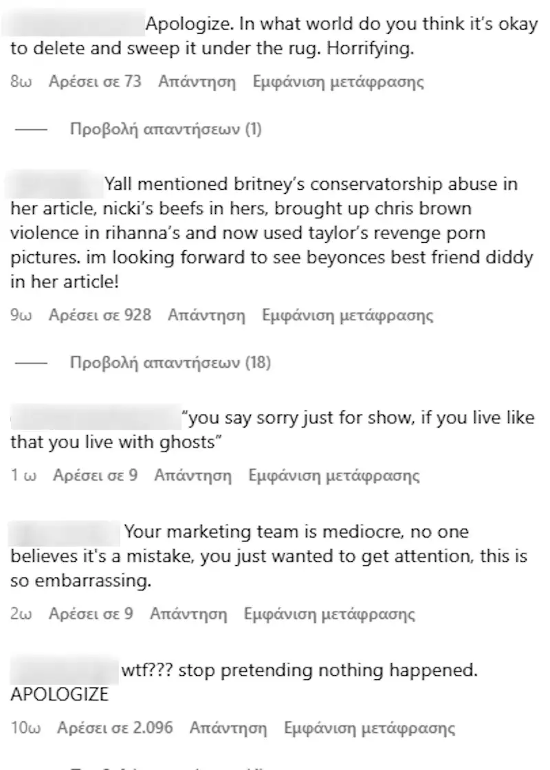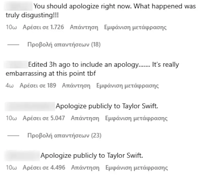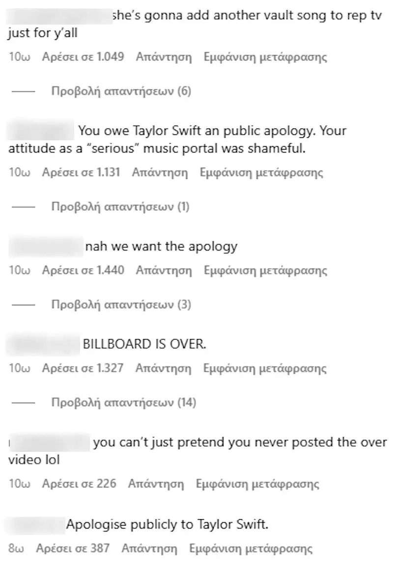 Το Billboard σε δική του ανάρτηση έγραψε μία απολογία απέναντι στην ποπ σταρ: «Λυπούμαστε βαθύτατα για την Taylor Swift και όλους τους αναγνώστες και τους θεατές μας που σε ένα βίντεο γιορτάζοντας τα επιτεύγματα της Swift, συμπεριλάβαμε ένα κλιπ που την απεικόνιζε ψευδώς. Αφαιρέσαμε το κλιπ από το βίντεό μας και λυπούμαστε ειλικρινά για το κακό που προκαλέσαμε με αυτό το λάθος».
