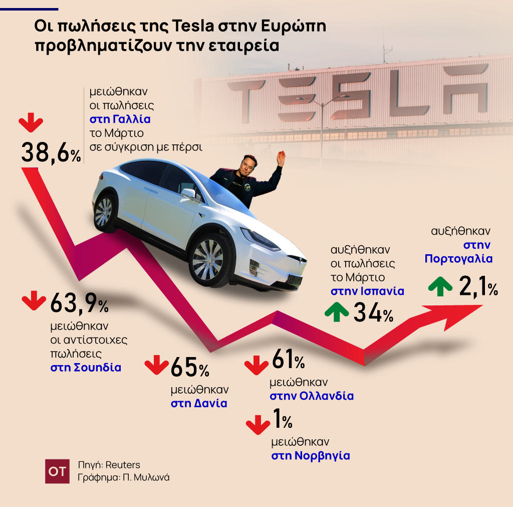 Στη Δανία οι ταξινομήσεις οχημάτων Tesla για το συγκεκριμένο μήνα ανήλθαν σε 593, μειωμένες κατά 65,6%. Οι πωλήσεις οχημάτων της αμερικανικής αυτοκινητοβιομηχανίας μειώθηκαν κατά 61% στην Ολλανδία, φτάνοντας τις 1.536 μονάδες. Οι τριμηνιαίες πωλήσεις Tesla μειώθηκαν κατά 41,1% στη Γαλλία, 55,3% στη Σουηδία, 12,5% στη Νορβηγία, 55,3% στη Δανία και 49,7% στην Ολλανδία, δείχνουν στοιχεία του Reuters