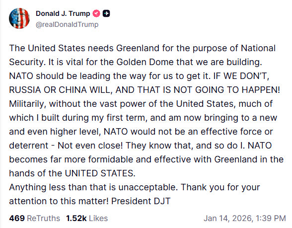 «Οι Ηνωμένες Πολιτείες χρειάζονται τη Γροιλανδία για λόγους εθνικής ασφάλειας. Είναι ζωτικής σημασίας για το Golden Dome που χτίζουμε. Το ΝΑΤΟ πρέπει να μας οδηγήσει στο να το αποκτήσουμε. ΑΝ ΔΕΝ ΤΟ ΚΑΝΟΥΜΕ ΕΜΕΙΣ, ΘΑ ΤΟ ΚΑΝΟΥΝ Η ΡΩΣΙΑ Ή Η ΚΙΝΑ, ΚΑΙ ΑΥΤΟ ΔΕΝ ΘΑ ΣΥΜΒΕΙ!