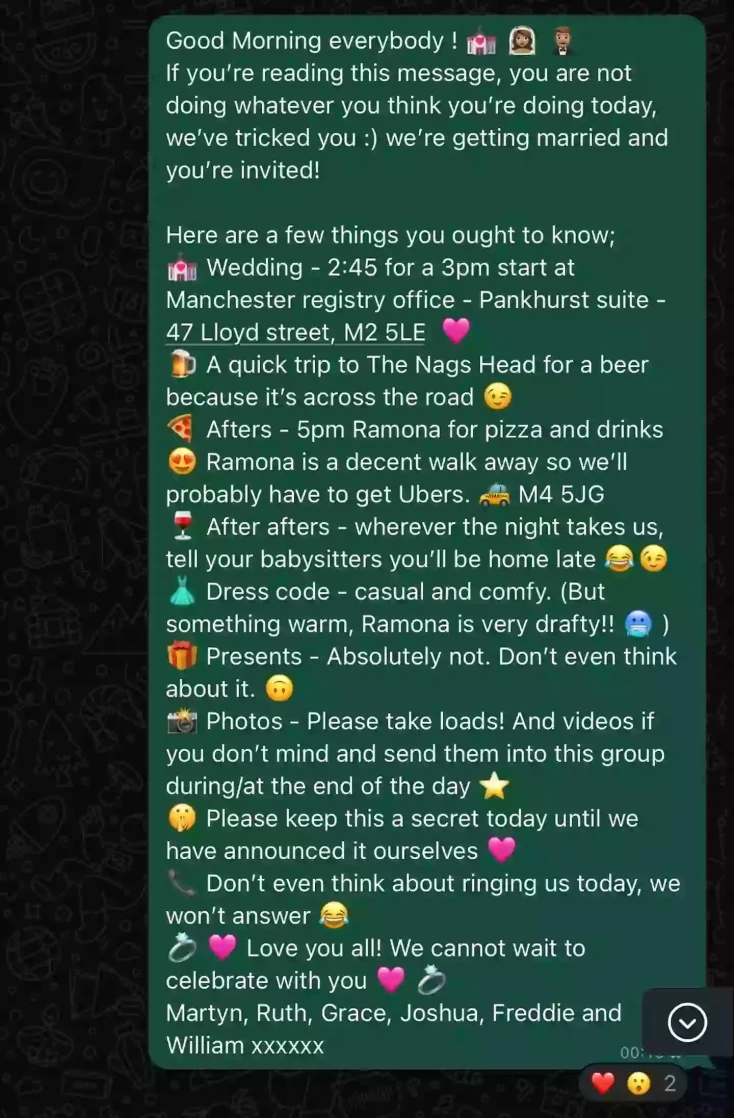 Αυτό σκέφτηκε και αποφάσισε για τον γάμο του ένα δαιμόνιο ζευγάρι από το Μάντσεστερ, η 35χρονη Ρουθ και ο 38χρονος Μάρτιν. Ήθελαν να κάνουν έναν «χαλαρό» γάμο, χωρίς αντιπαθητικούς στην…πατέα και σκέφτηκαν ότι ο καλύτερος τρόπος για να το πετύχουν αυτό ήταν να δώσουν στους 24 καλεσμένους τους μηδενική ειδοποίηση.