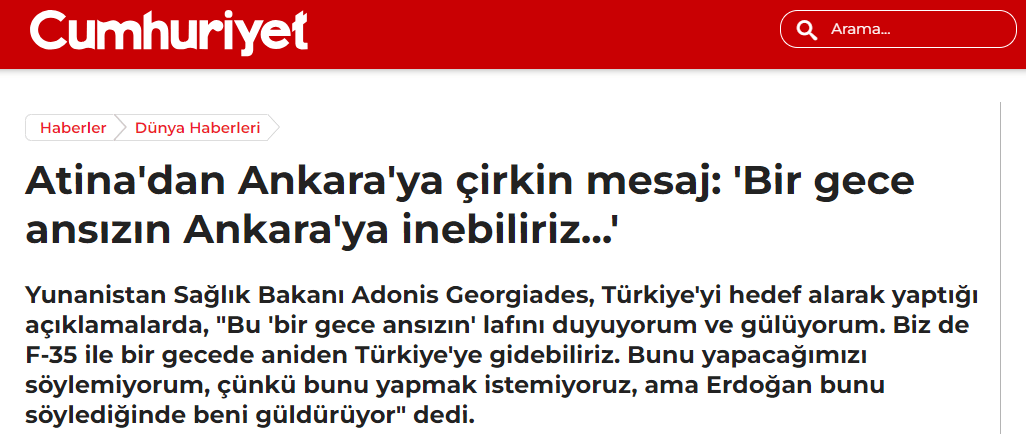 «Σκανδαλώδη λόγια του Έλληνα υπουργού» Άδωνι Γεωργιάδη, γράφει το Haber7 και προσθέτει: «ο Έλληνας υπουργός Υγείας Γεωργιάδης απάντησε στα λόγια του Προέδρου Ερντογάν, λέγοντας ‘μπορούμε να έρθουμε ξαφνικά μια νύχτα’ και απείλησε: ‘στην πραγματικότητα, μπορούμε να έρθουμε στην Τουρκία ξαφνικά ένα βράδυ με τα F-35 που αγοράσαμε’».