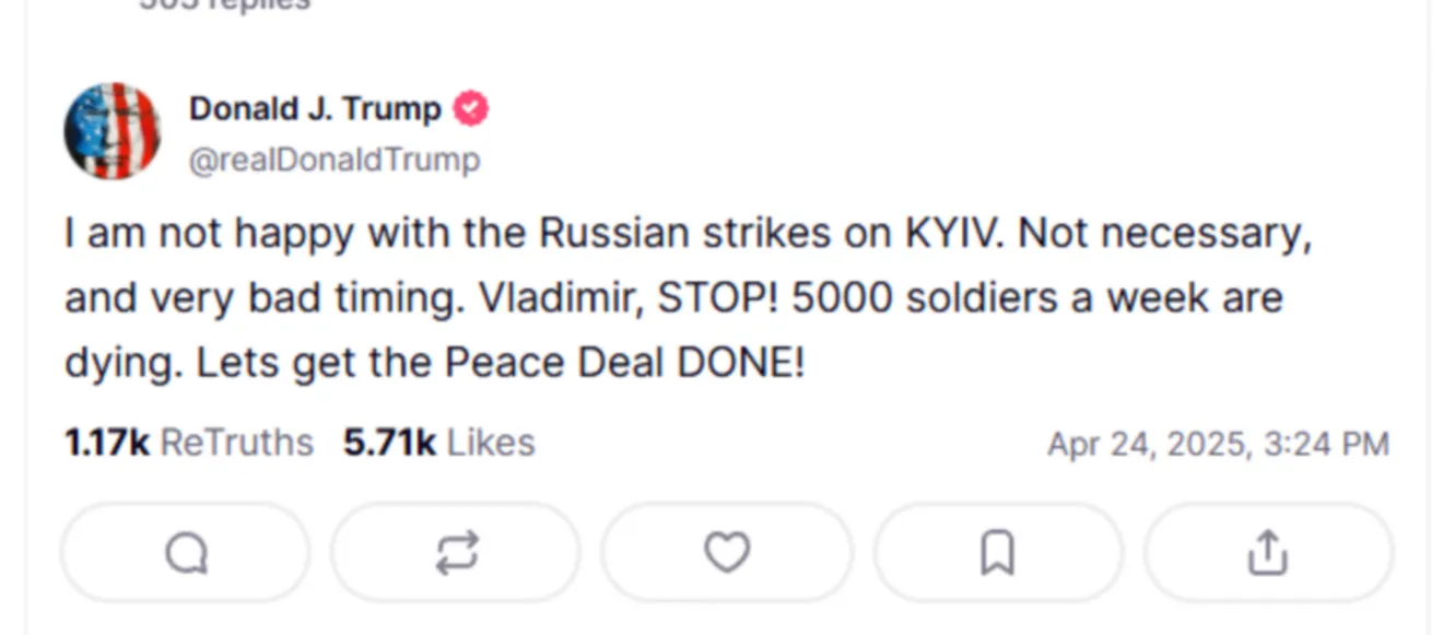 Με μία ανάρτηση στο προσωπικό του Μέσο Κοινωνικής Δικτύωσης Truth, ο Ντόναλντ Τραμπ εκφράζει την δυσαρέσκειά του για το σημερινό ρωσικό πλήγμα στο Κίεβο και καλεί τον Πούτιν να σταματήσει τις εχθροπραξίες και να συμφωνήσει σε ειρήνη.