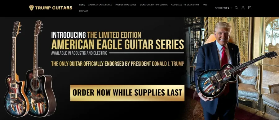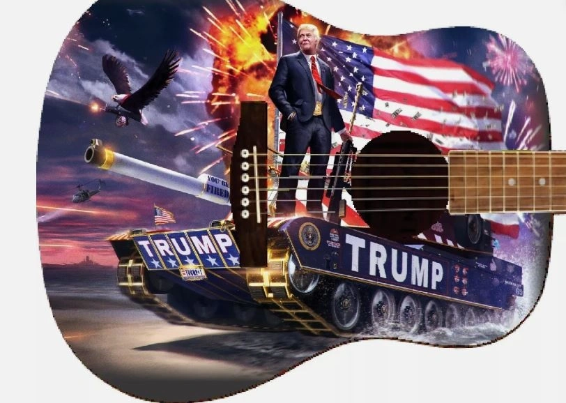Ο Τραμπ δημοσίευσε την Τετάρτη στην πλατφόρμα του Truth Social μια φωτογραφία του να κρατά μια κιθάρα «Limited Edition ’45» όπως είπε, ένα ηλεκτρικό μοντέλο με μια αμερικανική σημαία και έναν αετό και το σύνθημα της εκστρατείας του «Ας Κάνουμε την Αμερική Σπουδαία Ξανά» (Make America Great Again). Τόσο ακουστικές όσο και ηλεκτρικές είναι διαθέσιμες στην τιμή των 1.250 και 1.500 δολαρίων αντίστοιχα, όπως επίσης και τα μοντέλα «Presidential» και «God Bless the USA» και οι κιθάρες «Signature Edition», οι οποίες – στην τιμή των 10.000 δολαρίων – περιλαμβάνουν επίσης την υπογραφή του Tραμπ
