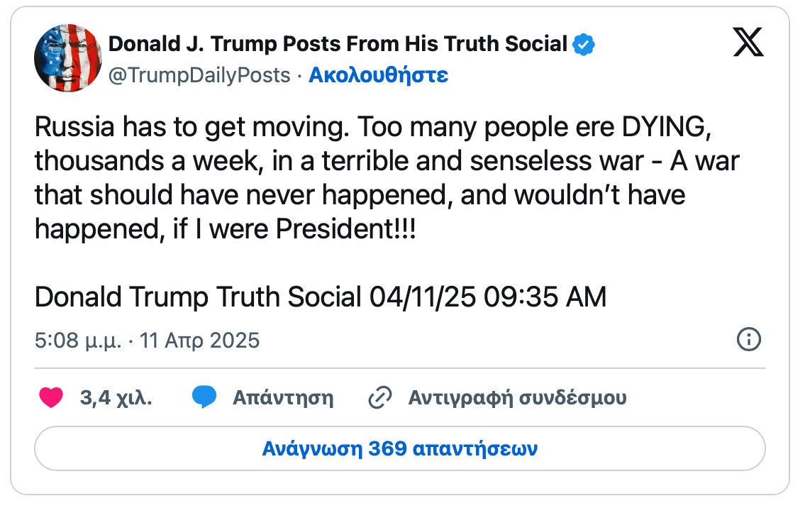 Νέο μήνυμα προς την Ρωσία και τον Βλαντίμιρ Πούτιν έστειλε σήμερα (11.04.2025) ο Πρόεδρος των ΗΠΑ, Ντόναλντ Τραμπ, με ανάρτηση που έκανε στην πλατφόρμα του, Truth Social.