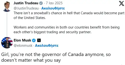 Σε σχόλιο του στην ανάρτηση του Τζάστιν Τριντό ότι ο Καναδάς δεν υπάρχει καμία περίπτωση να γίνει μέρος των Ηνωμένων Πολιτείων, ο Έλον Μασκ απάντησε: «Κοπελιά, δεν είσαι ο κυβερνήτης του Καναδά πια, έτσι δεν έχει σημασία τι λες».