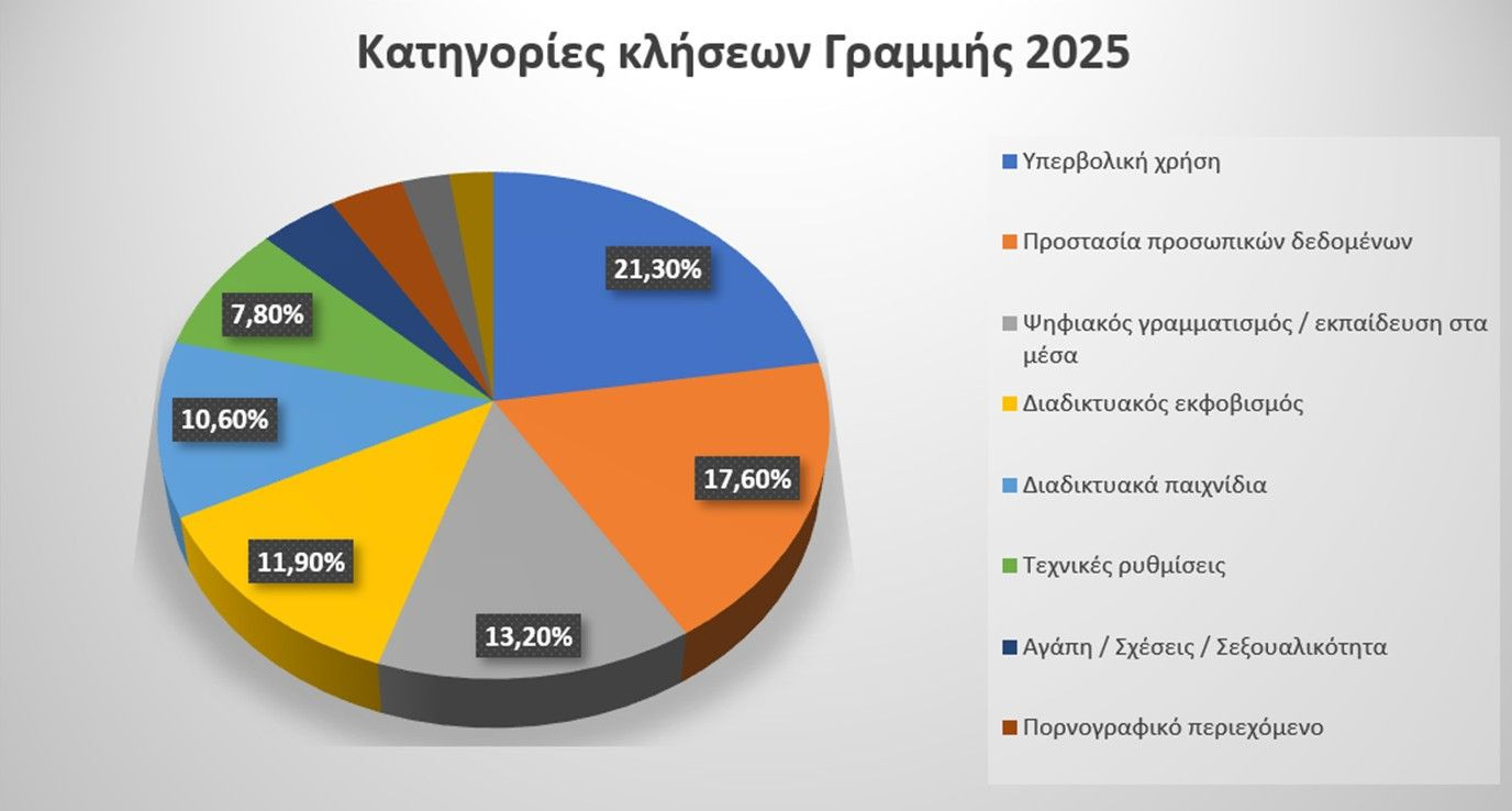 Τα περισσότερα παιδιά και έφηβοι που κάλεσαν την γραμμή βοήθειας κατά την διάρκεια του 2025 ήθελαν συμβουλές για την υπερβολική χρήση διαδικτύου, τον διαδικτυακό εκφοβισμό και την προστασία προσωπικών δεδομένων.