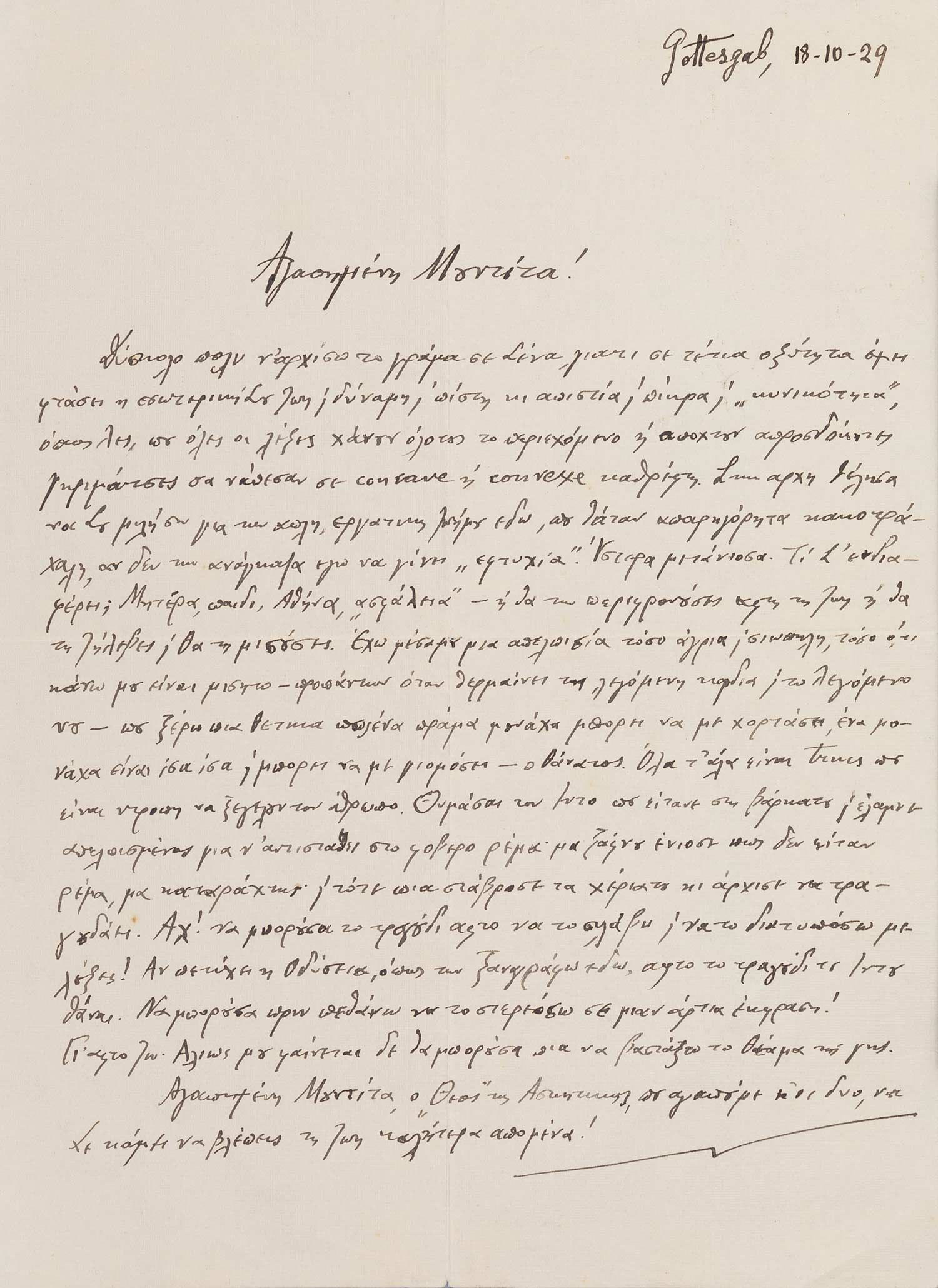 Οι παρούσες επιστολές (μαζί με 60 επιστολές της Λαμπρίδη προς τον Καζαντζάκη) είναι δημοσιευμένες στο Ἀλληλογραφία μέ τή Μουντίτα (βλ. παραπάνω). Στην «Εἰσαγωγή» διαβάζουμε: «Ἡ ἀλληλογραφία τῆς Ἕλλης Λαμπρίδη μέ τόν Νίκο Καζαντζάκη εἶναι ἕνας μακροχρόνιος διάλογος ἀνάμεσα σέ δύο ἐξέχουσες φυσιογνωμίες τῆς ἑλληνικῆς διανόησης. Εἶναι συγχρόνως ἕνας διάλογος ἀνάμεσα σέ δύο ἀνθρώ πους πού ἀγαπήθηκαν, ἕνιωσαν βαθιά φιλία ὁ ἕνας γιά τόν ἅλλο καί εἴχαν στενή σχέση καί πνευματική ἐπικοινωνία». € 12.000-16.000