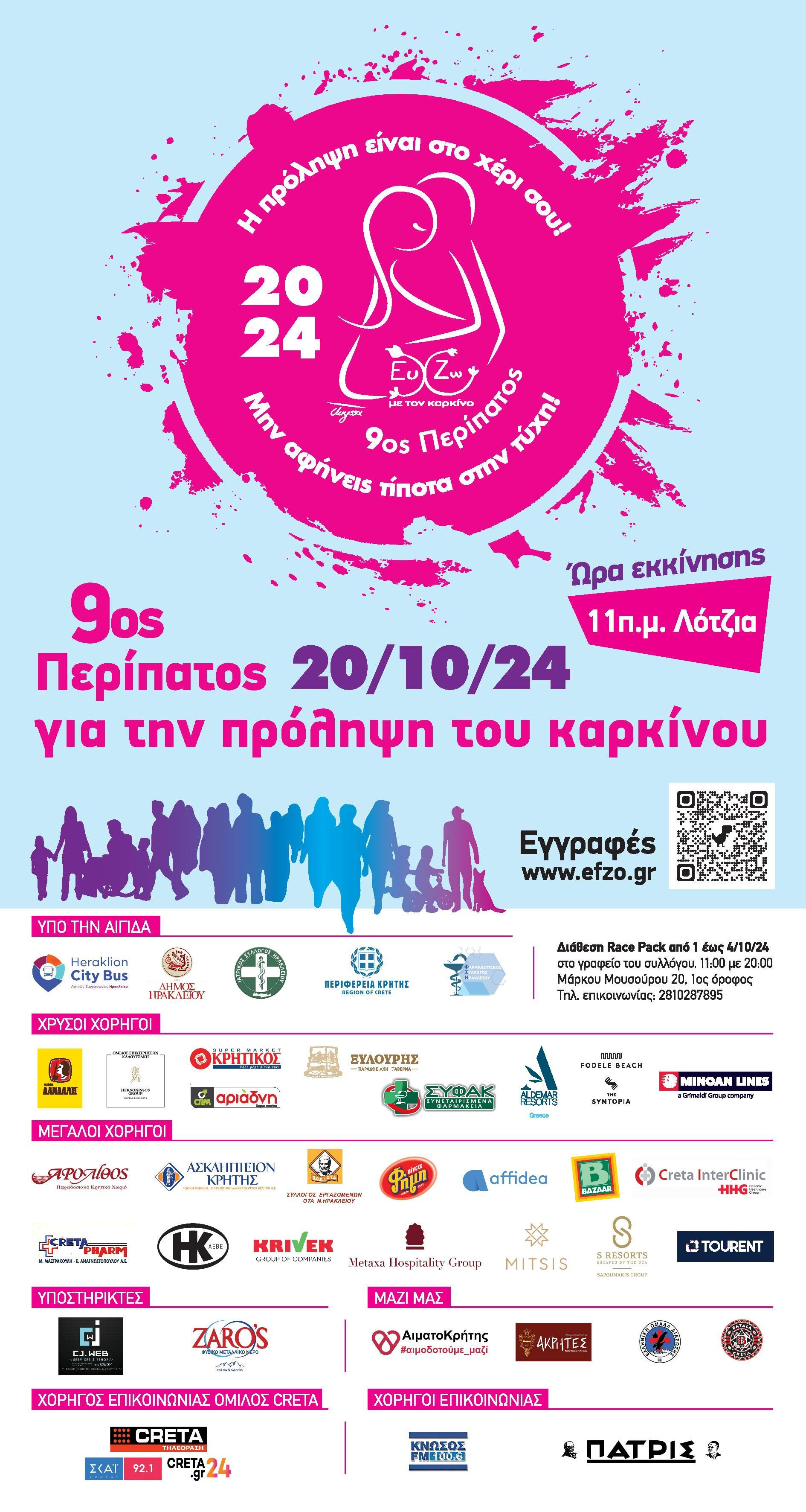 Ο 9ος περίπατος για την πρόληψη του καρκίνου πραγματοποιείται υπό την αιγίδα του Αστικού ΚΤΕΛ Ηρακλείου, του Δήμου Ηρακλείου, του Ιατρικού Συλλόγου Ηρακλείου, της Περιφέρειας Κρήτης, του Φαρμακευτικού Συλλόγου Ηρακλείου και με την στήριξη των Zaros Natural Mineral water και CJweb.