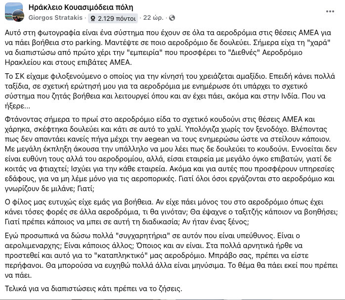 “Αυτό στη φωτογραφία είναι ένα σύστημα που έχουν σε όλα τα αεροδρόμια στις θέσεις ΑΜΕΑ για να πάει βοήθεια στο parking. Μαντέψτε σε ποιο αεροδρόμιο δε δουλεύει. Σήμερα είχα τη “χαρά” να διαπιστώσω από πρώτο χέρι την “εμπειρία” που προσφέρει το “Διεθνές” Αεροδρόμιο Ηρακλείου και στους επιβάτες ΑΜΕΑ.