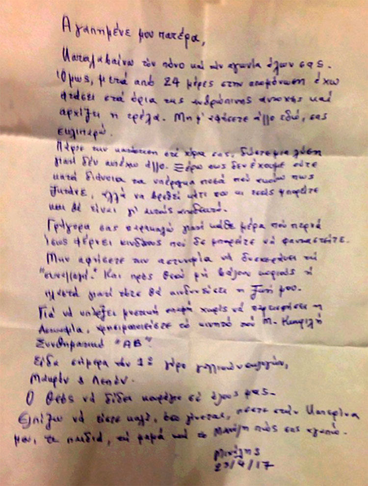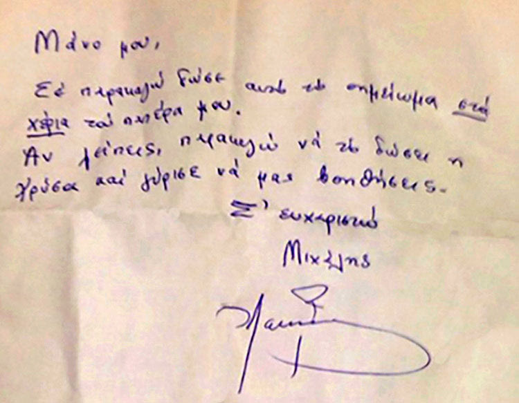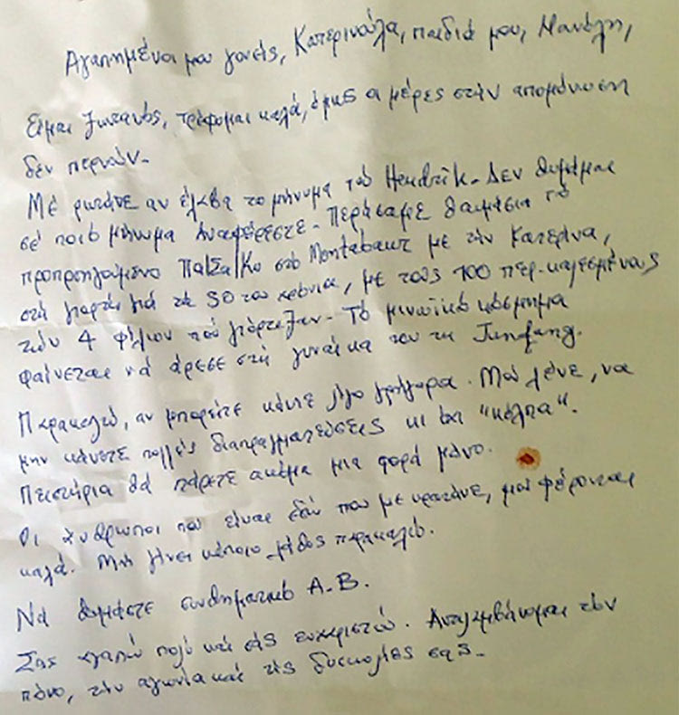 «Αγαπημένοι μου γονείς, Κατερινούλα, παιδιά μου, Μανόλη,